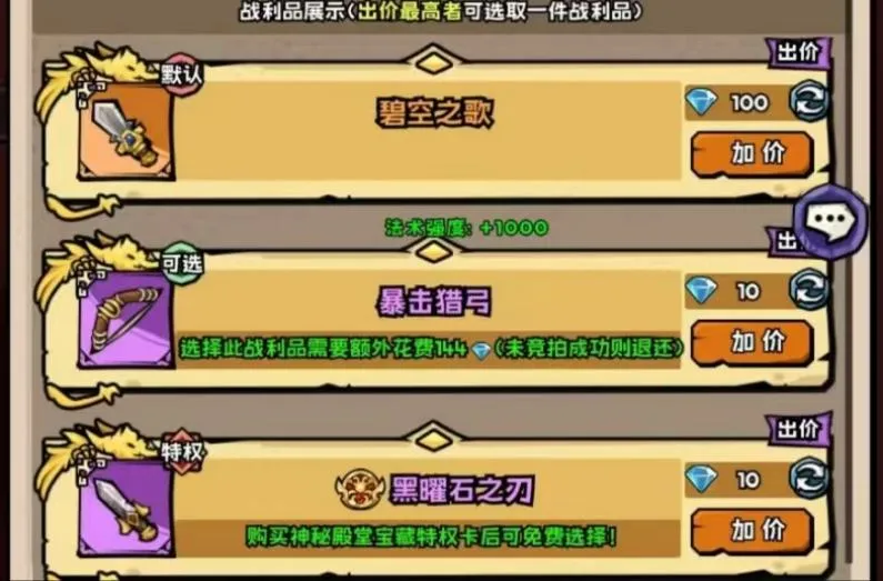 5)副本竞拍规则是跟英雄本规则一样的,唯一的区别就是三选一的第三件道具是不需要系统额外收取钻石的,但是想要竞拍第三个必须购买神秘殿堂宝藏特权的,即俗称的四卡。