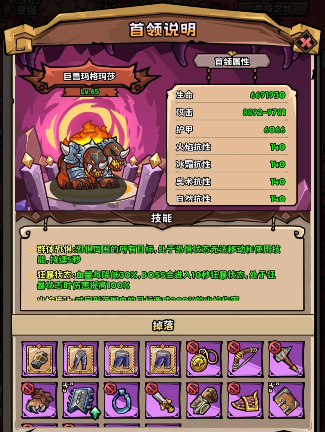 技能三:狂暴状态,每下降30%血就会狂暴10秒增伤100%。