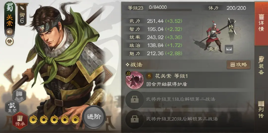 关索,蜀国6御枪兵,属性属于中上水平,智力成长稍差一些,属于中低水平。