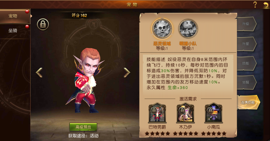 宠物:作为陪伴玩家成长的忠实伙伴,魔龙世界中有数十种宠物可供玩家选择,玩家可通过宠物升级、升星、宠物技能升级、以及连携技能的佩戴来提升自身实力。